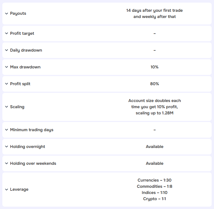 A differenza di altre prop firm senza challenge presenta condizioni di drawdown favorevoli: